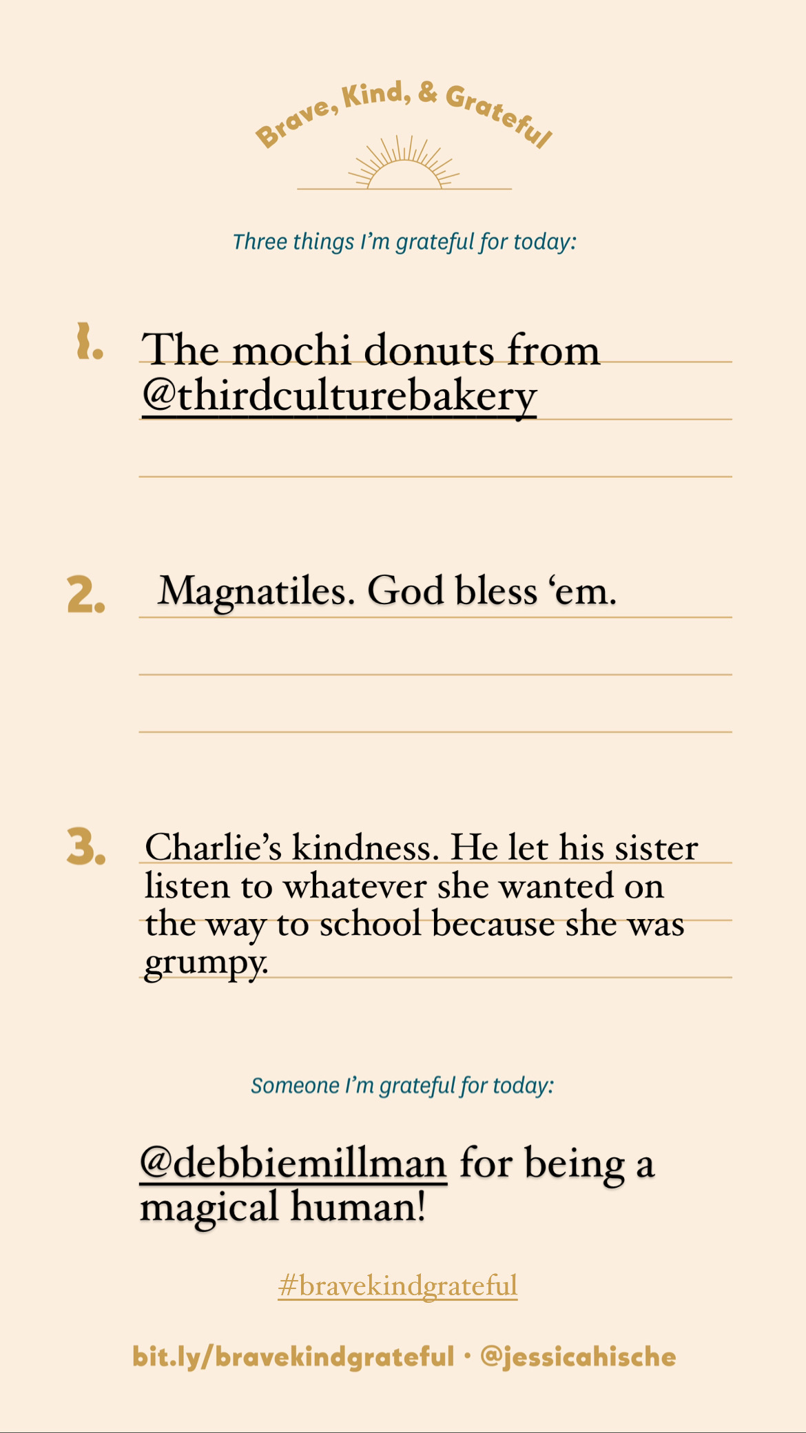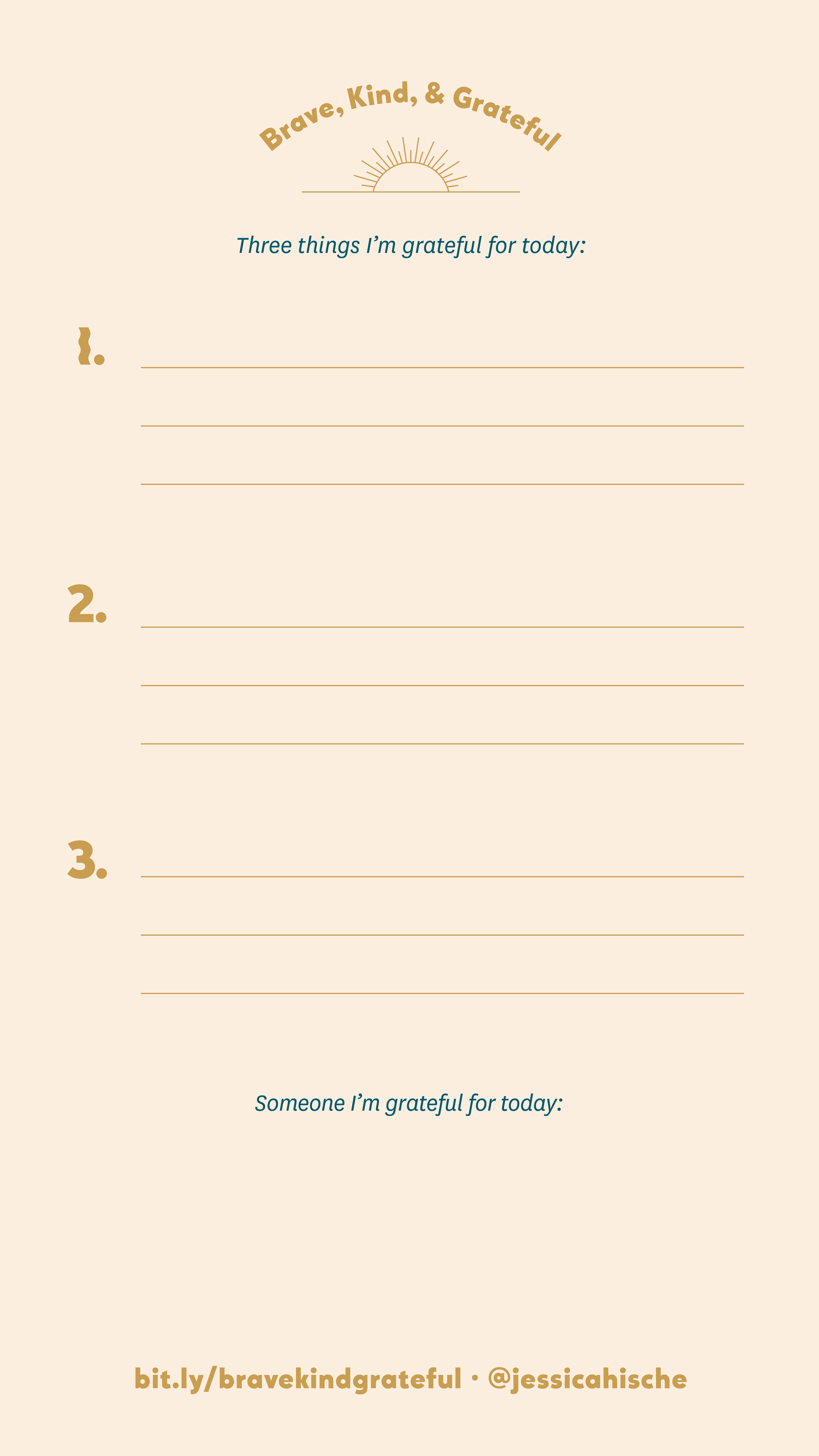 To enter the contest, you'll be gratitude journaling! You must post an instagram story each day from December 6th through December 10th using this image template. Fill out the template for each post and tag #bravekindgrateful (no need to tag me, though I will be happy to read them all!). At the end of the week, submit your entry via this google form with your name, contact information, and upload proof of participation. Entries must be submitted by Sunday December 12th. Winners will be notified the following week and prizes will take place in the new year.